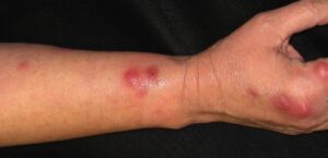 Normalmente as feridas são nas extremidades como pés e mãos, formando uma lesão avermelhada, algumas vezes com secreção, que vai piorando e se espalhando, em menor velocidade.